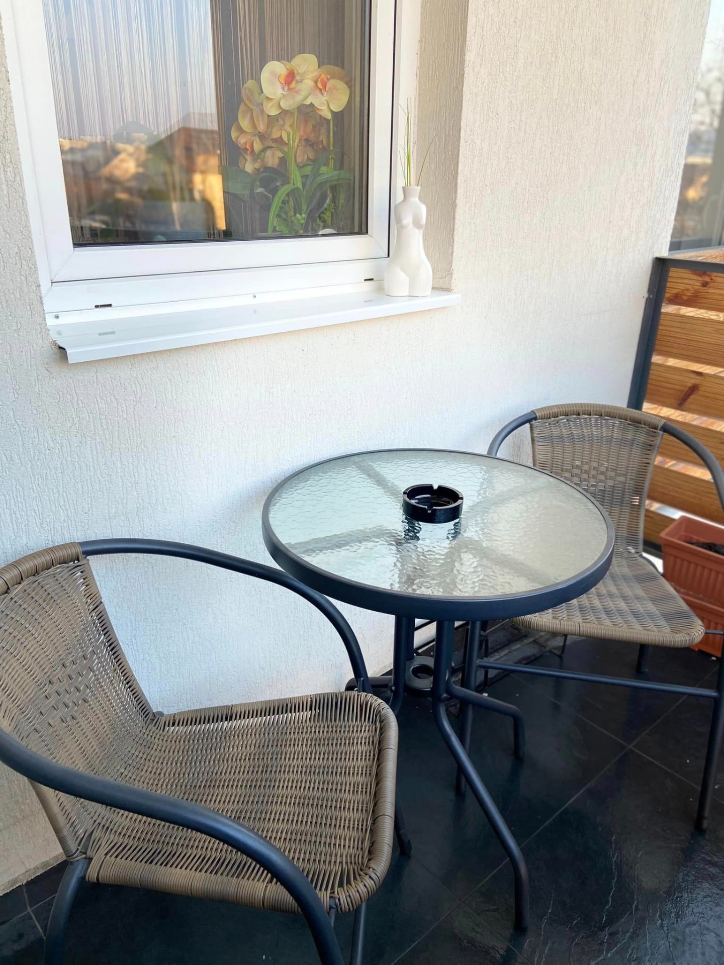 Măsuță cu scaune, priveliște luminoasă către oraș.