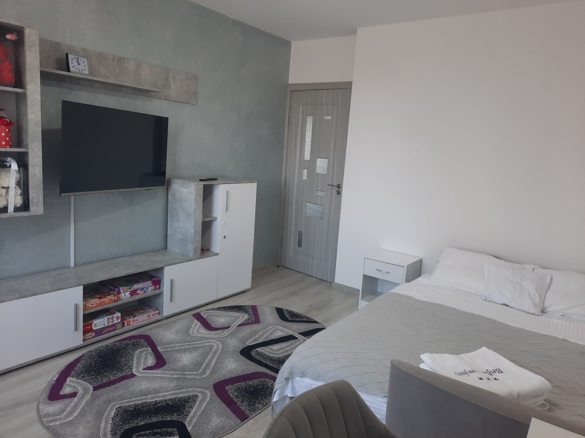 Noptieră, veioză, încărcător telefon, jucării/cărți pentru copii.