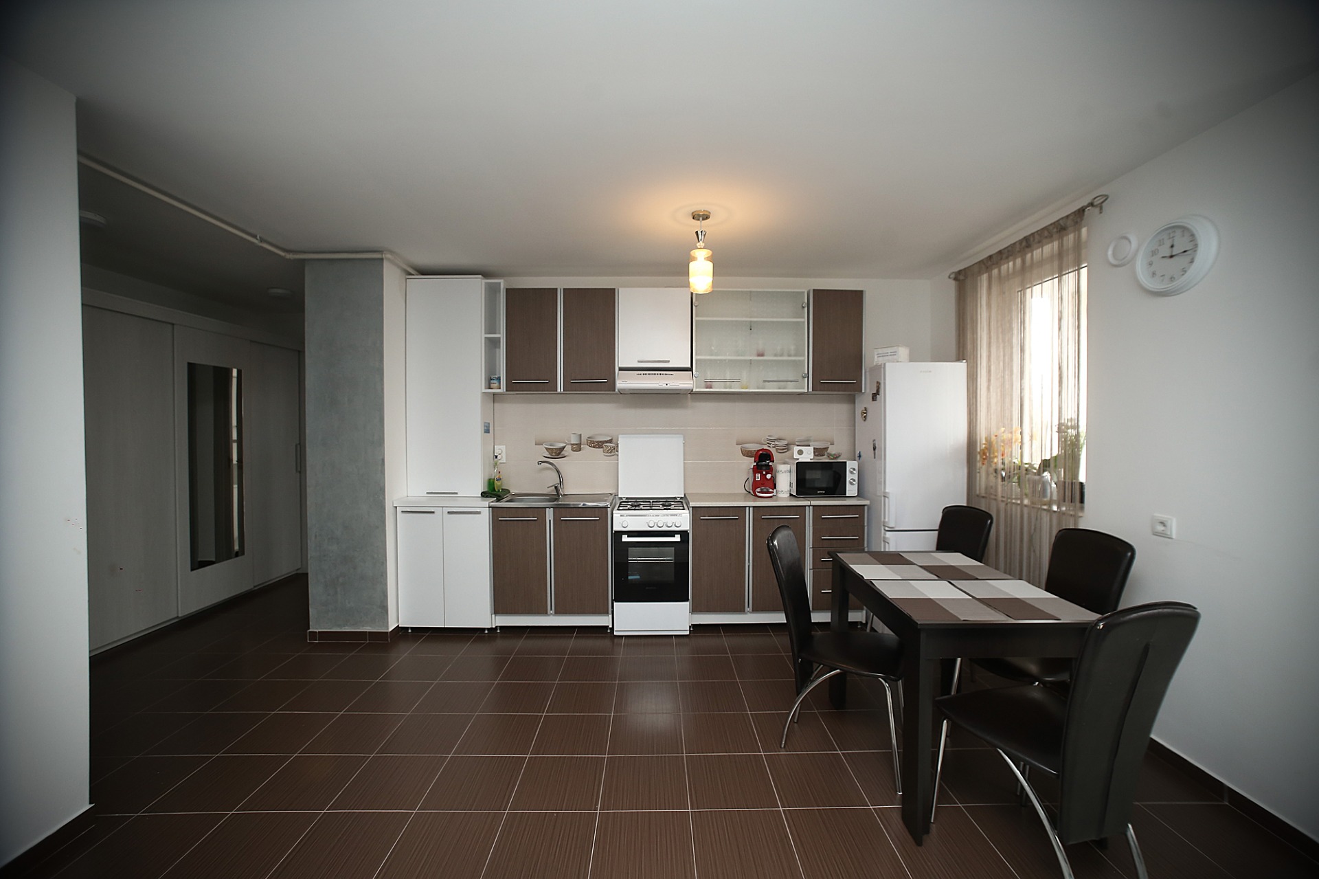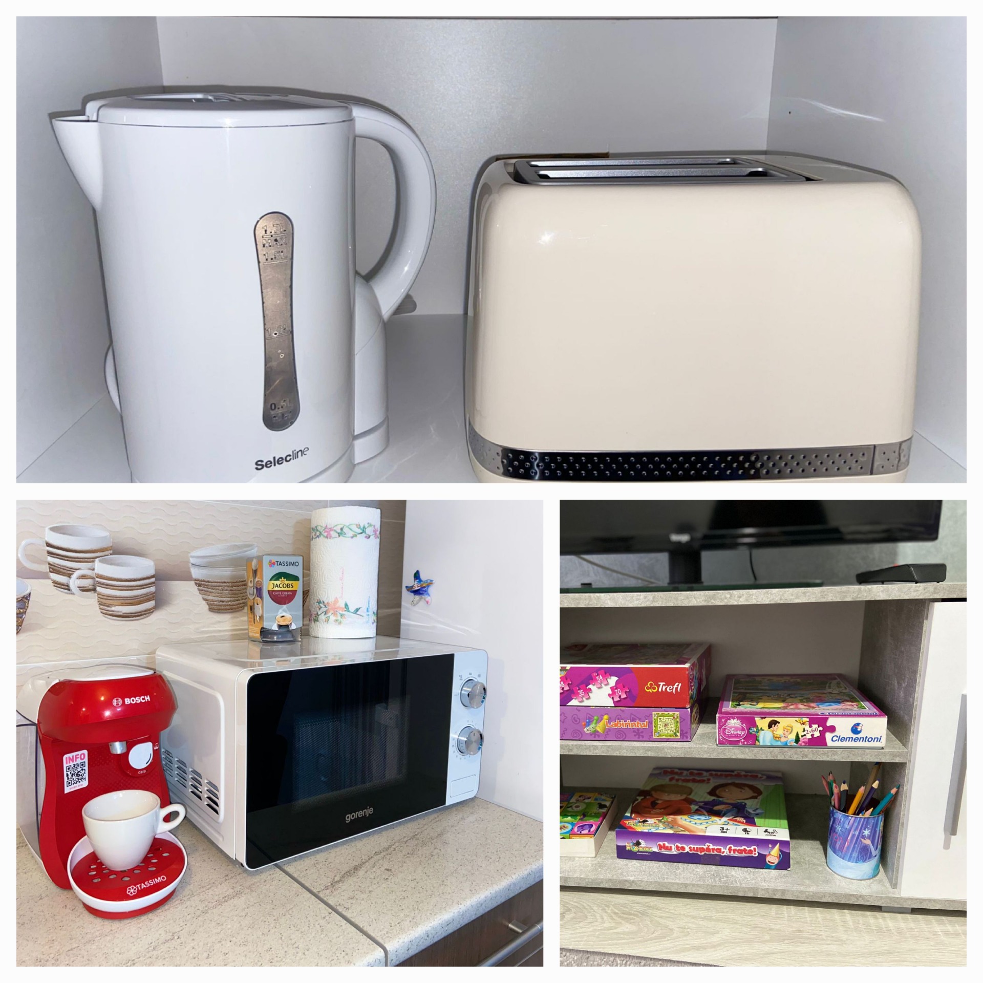 Bucătărie complet utilată: frigider-combină, aragaz cu hotă, cuptor, veselă, aparat de cafea Tassimo, presso cafea, fierbător, prăjitor de pâine, cuptor cu microunde, detergenți.